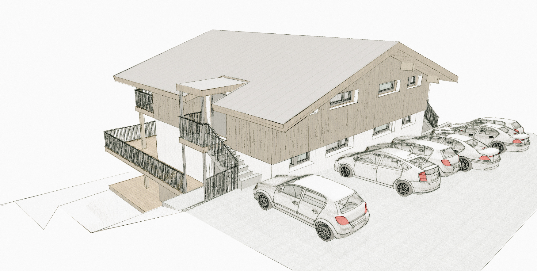 Die außenliegende Erschließung über neue Stiegenanlagen an Nord- und Südseite sorgt nicht nur für eine eindeutige Zugangssituation, sondern unterstützt auch die Ablesbarkeit der einzelnen Einheiten im Erscheinungsbild des Gebäudes. Jede Wohnung erhält dadurch ihren eigenen Charakter und eine hohe Eigenständigkeit innerhalb des Gesamtvolumens des Umbaus.
